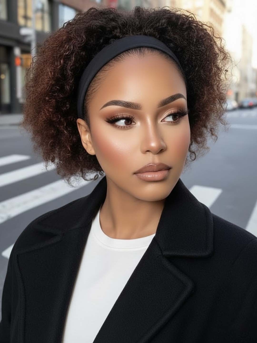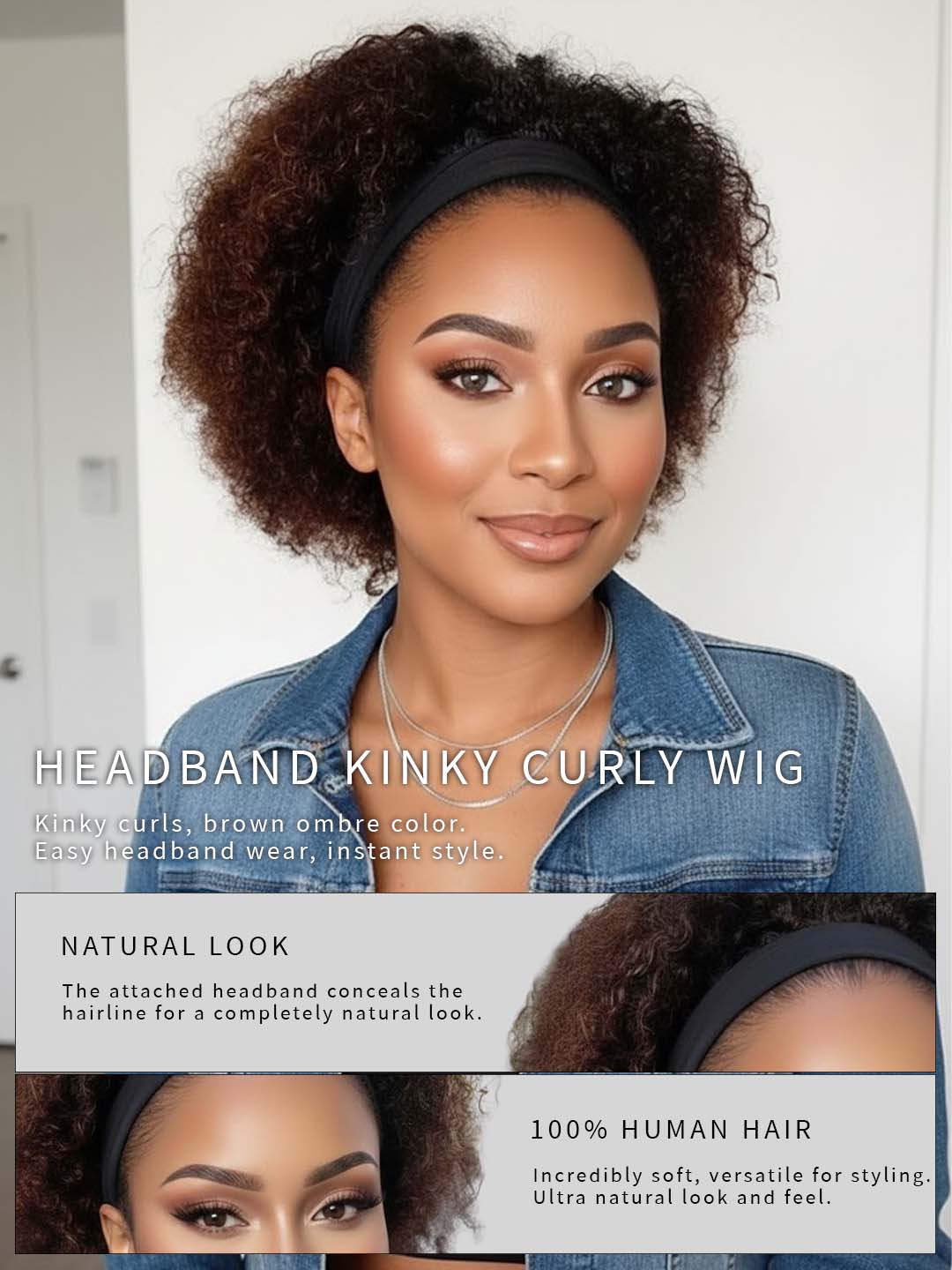Human Hair Headband Wig Pixie Cut Brown Ombre Kinky Curly Glueless Wig Natural Look