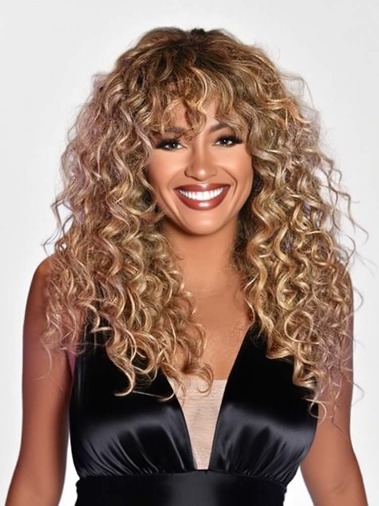 Ombre Brown Curly Wigs with Bangs 180% Density Glueless Human Hair Mini-closure Wigs