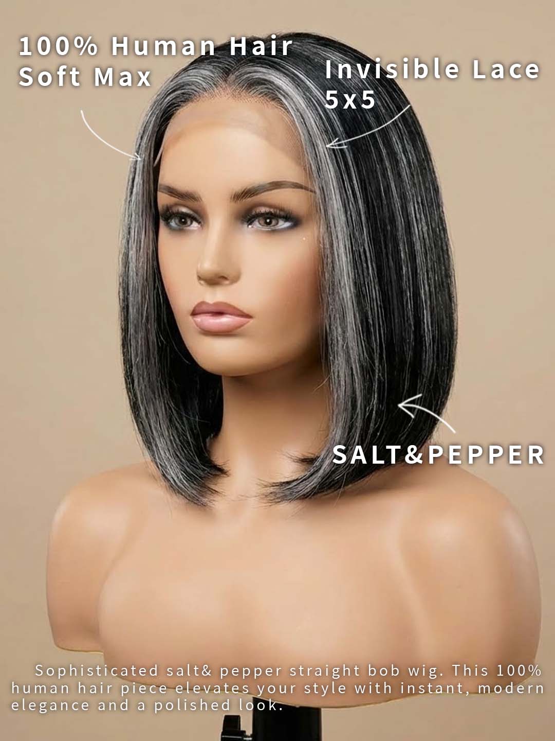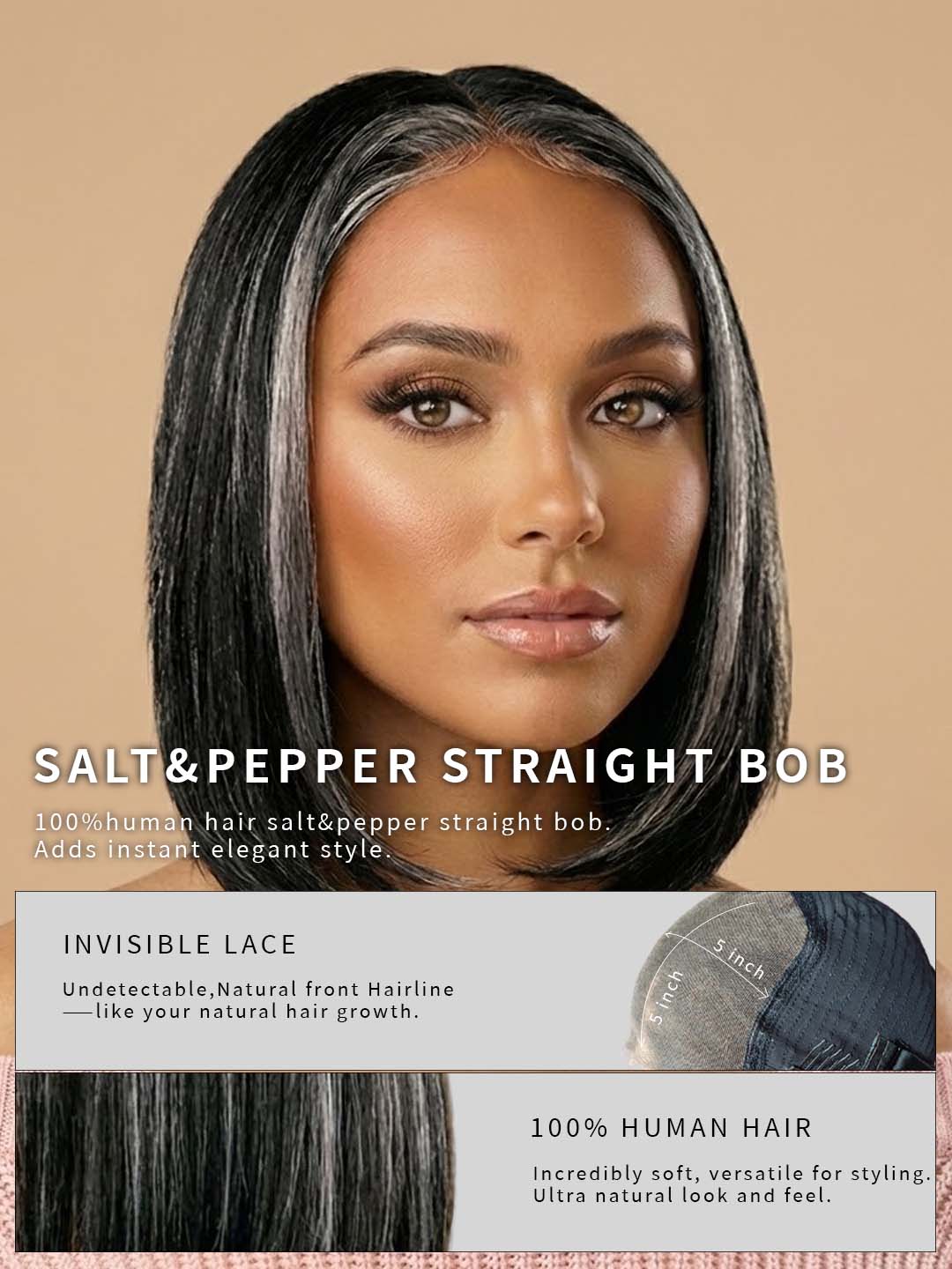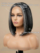 Be bold. Be graceful. Be naturally you with the Human Hair 5x5 Lace Closure Salt and Pepper Bob Wig.