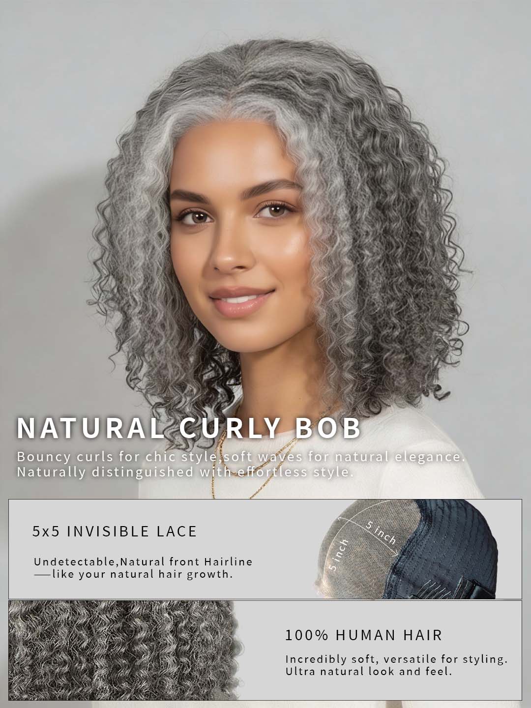 Celebrate your natural transition in style with our Varia Hair Salt and Pepper Color Curly Bob 5x5 Closure Lace Wig. Designed for women embracing their beautiful greying hair, this wig blends seamlessly with your natural tones — offering sophistication, comfort, and confidence in one look.