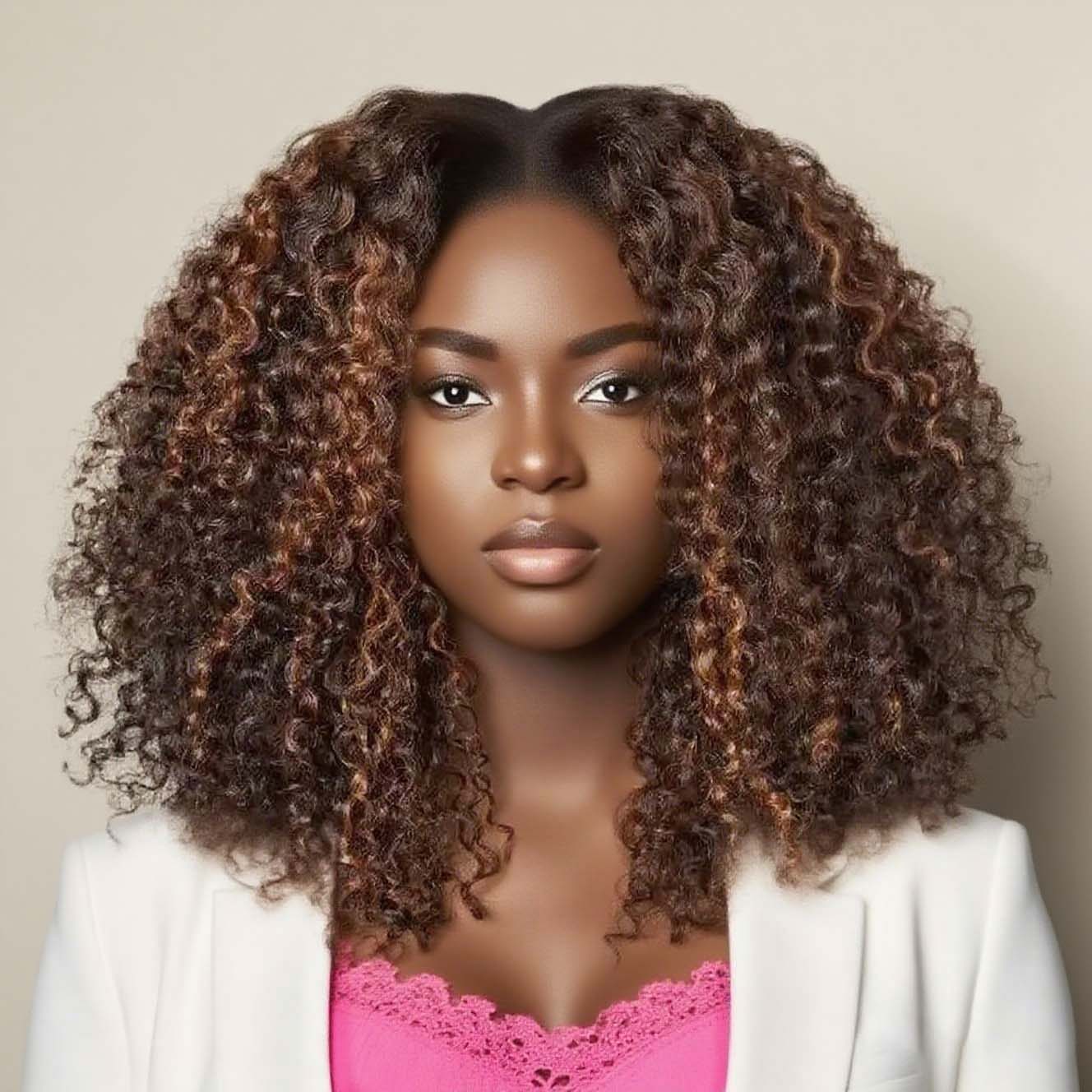 Turn heads effortlessly with the Kinky Curly Human Hair Glueless 5x5 HD Lace Closure Wig your go-to choice for bold, natural texture and easy everyday glam. Made from 100% premium human hair, this wig features soft, defined curls with beautiful copper highlights for a radiant, dimensional look that complements every skin tone.