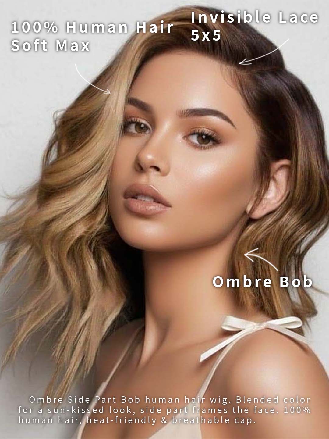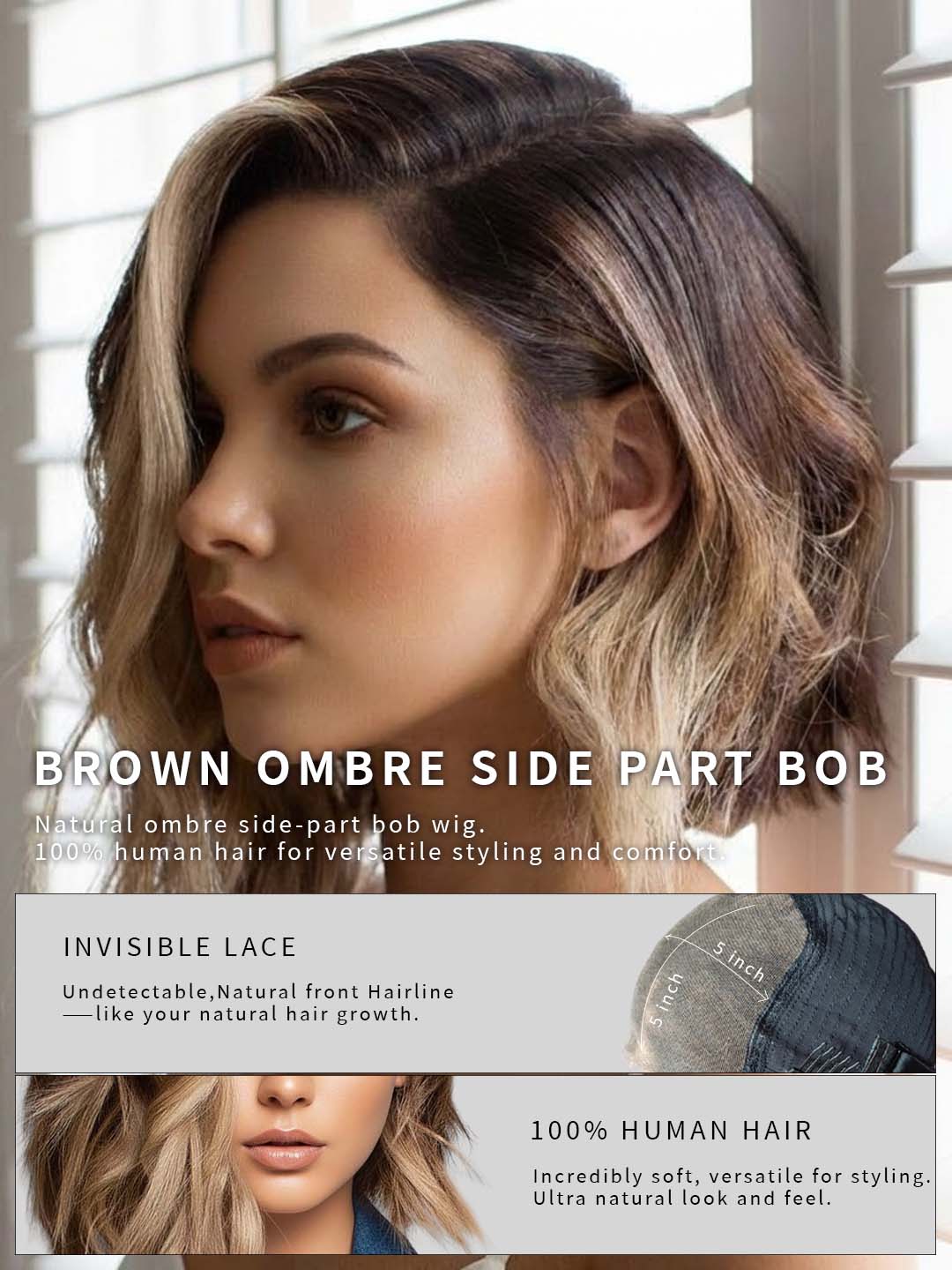 Human Hair Short Bob Wig Side Part Brown Blonde Ombre Highlights 5x5 Closure Lace Wig