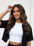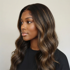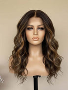 Rich brown base with blonde balayage highlights creates a dimensional, luminous finish that flatters all skin tones.