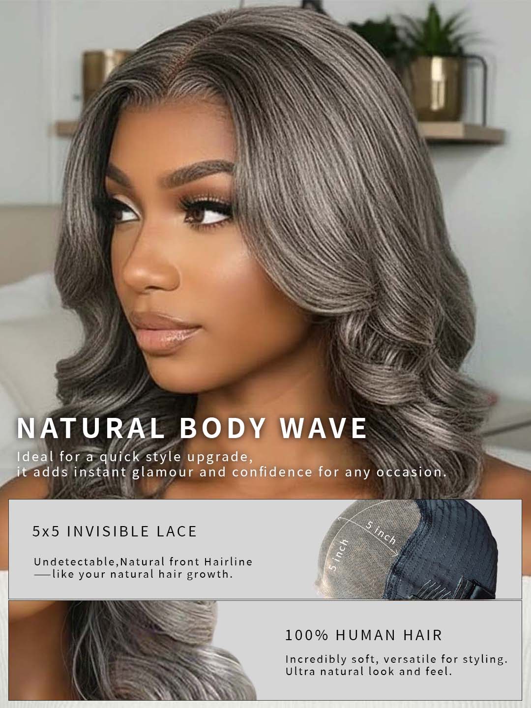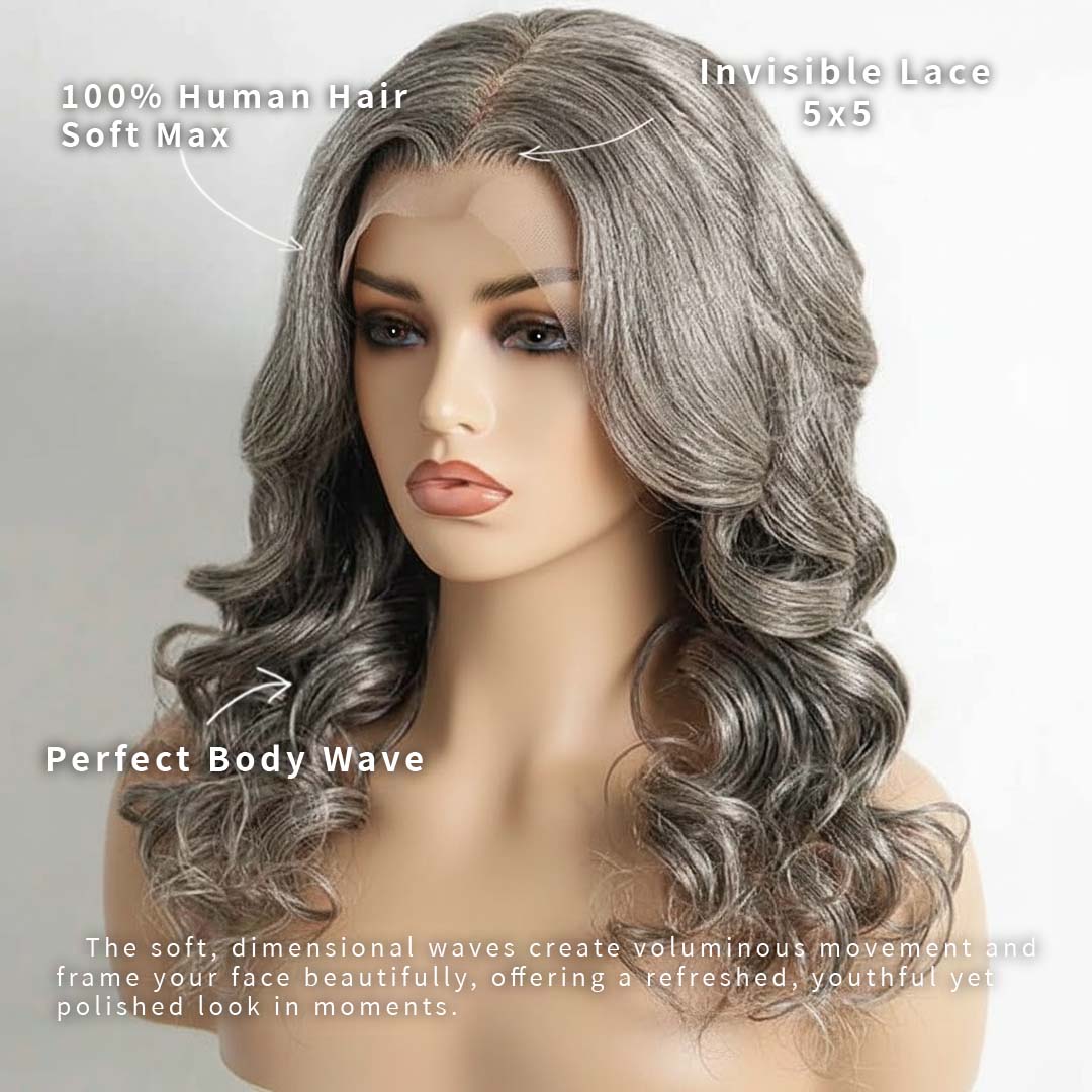 Embrace your timeless beauty with effortless confidence. Designed for women gracefully transitioning into gray or celebrating their salt-and-pepper charm, this Soul Lady Wear & Go Wig blends natural elegance with modern ease. Crafted from 100% human hair, it delivers a silky body wave texture that moves just like your own, soft, realistic, and undeniably sophisticated.