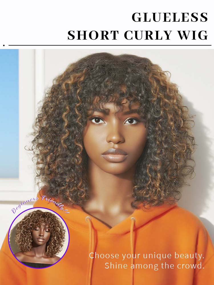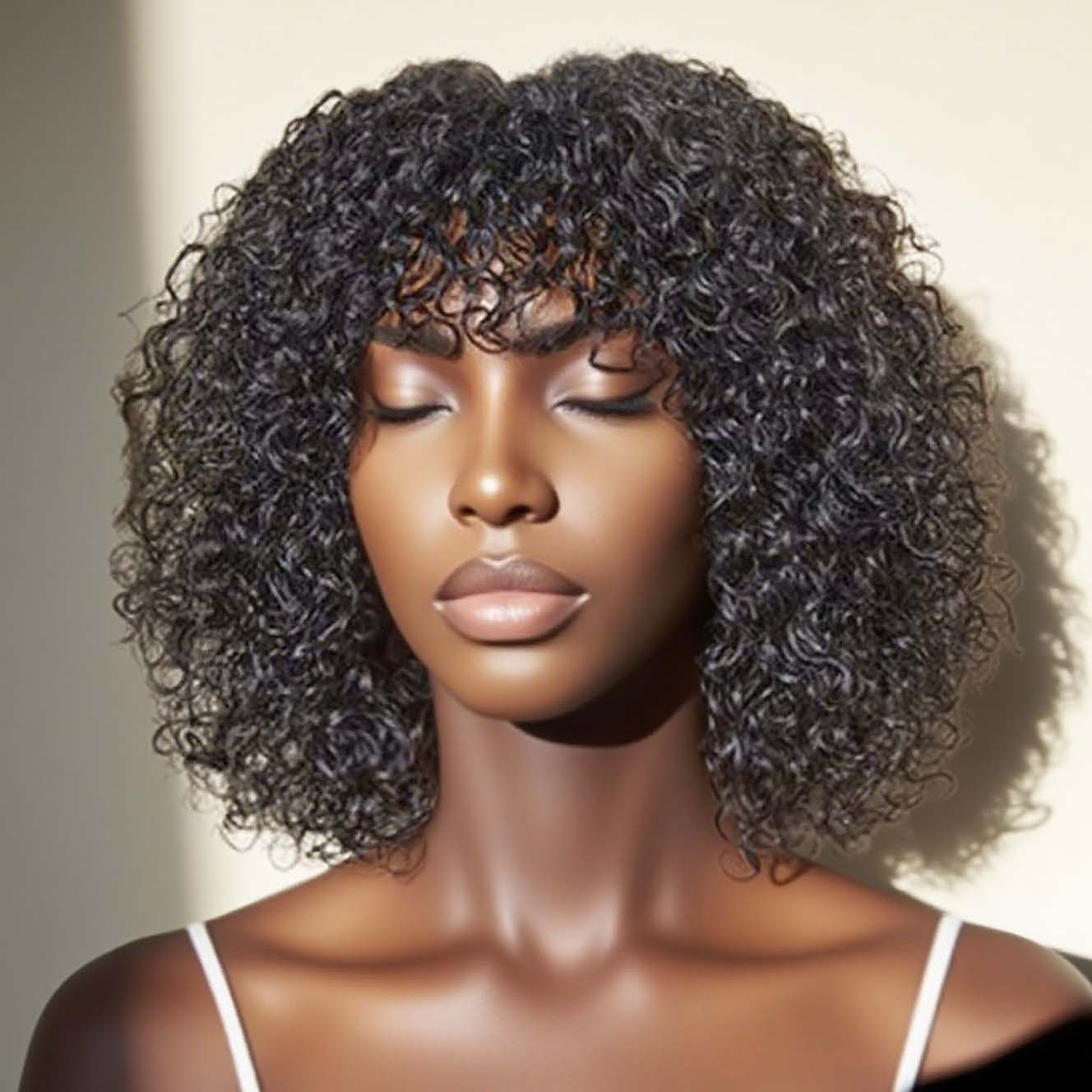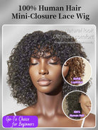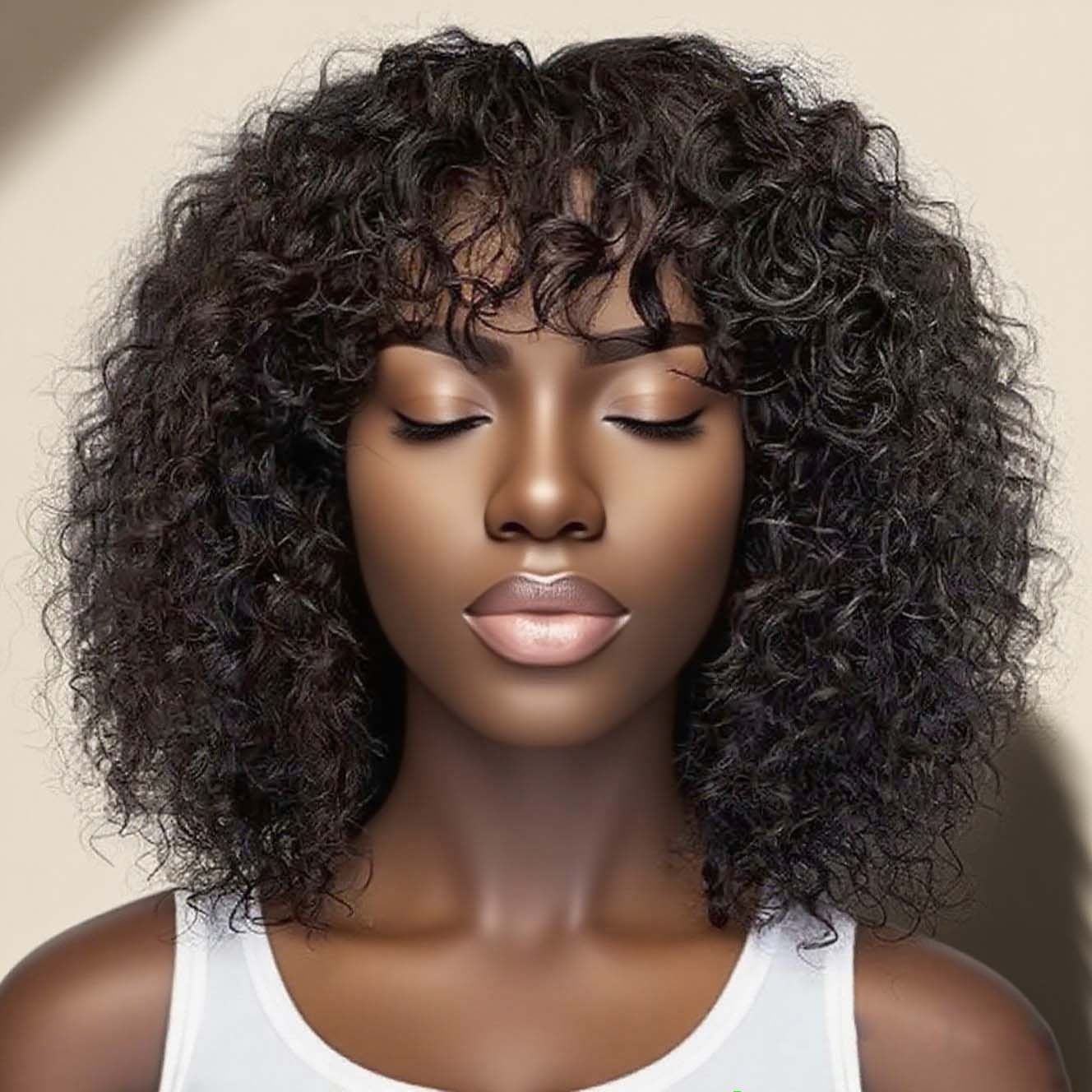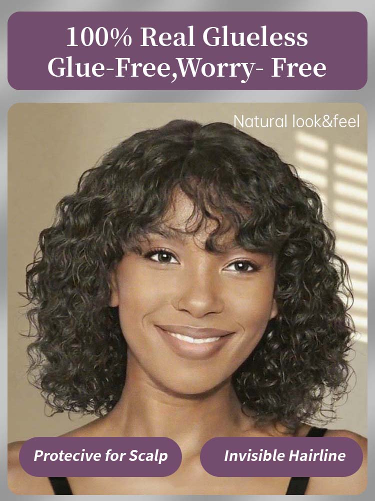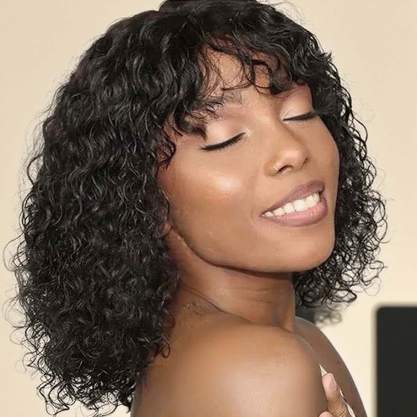 Beginner Friendly Water Wave Minimalist Lace Glueless Short Curly Wig with Bangs Mini-closure Lace Wig