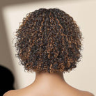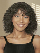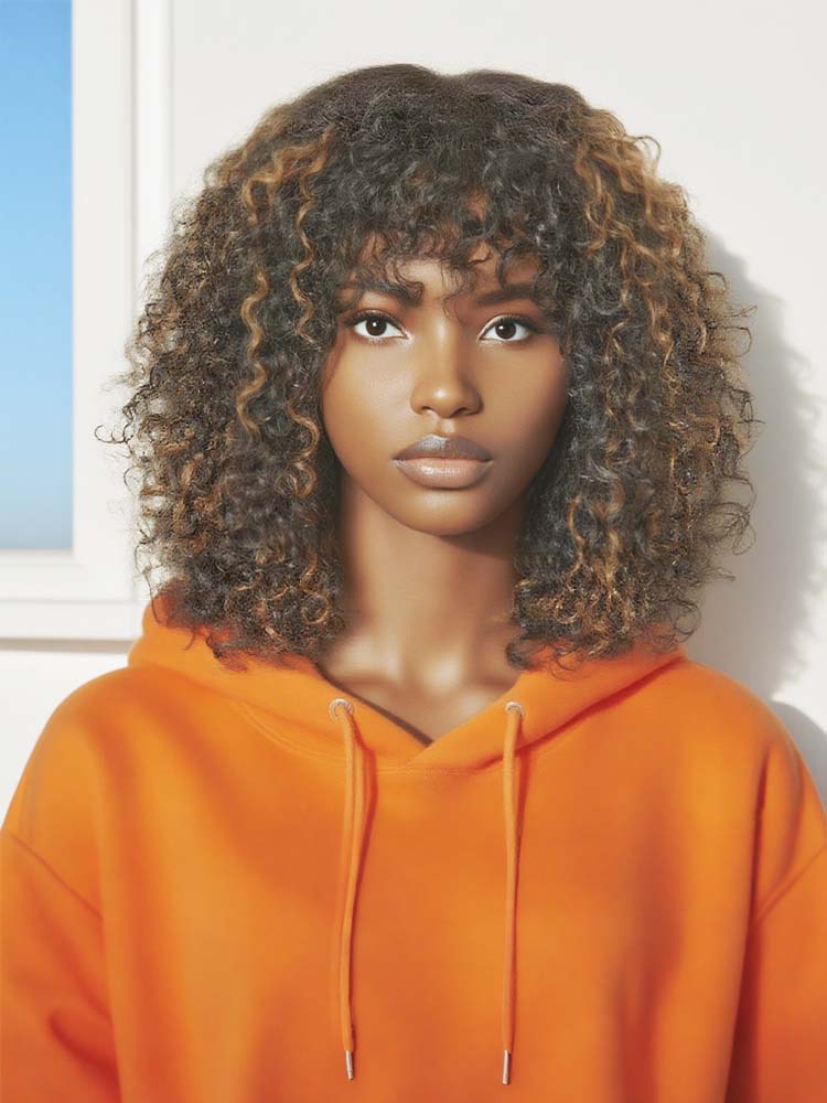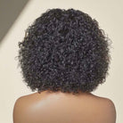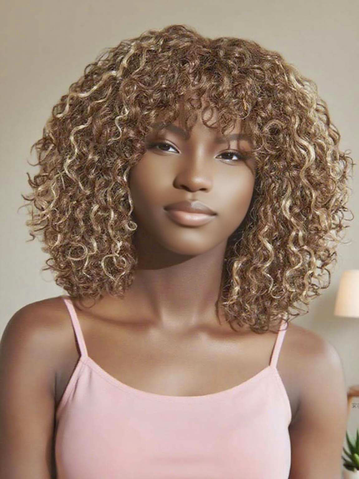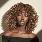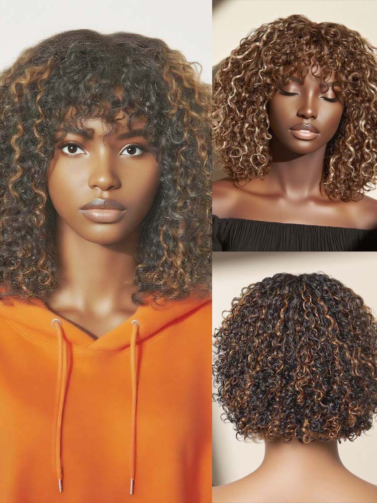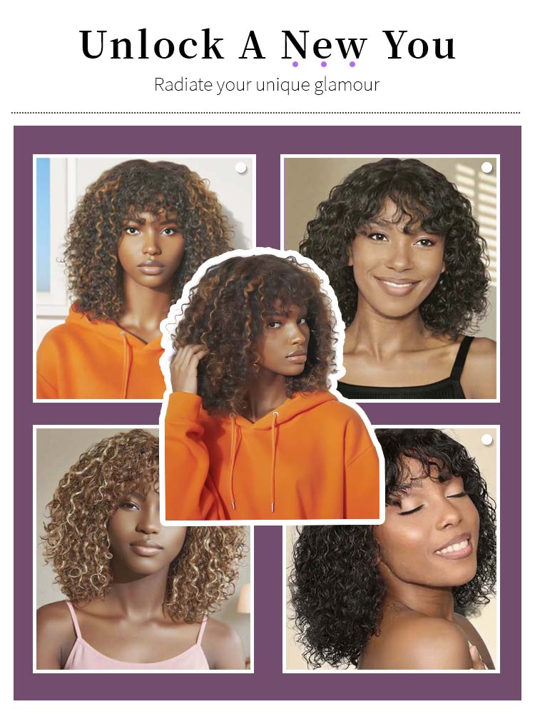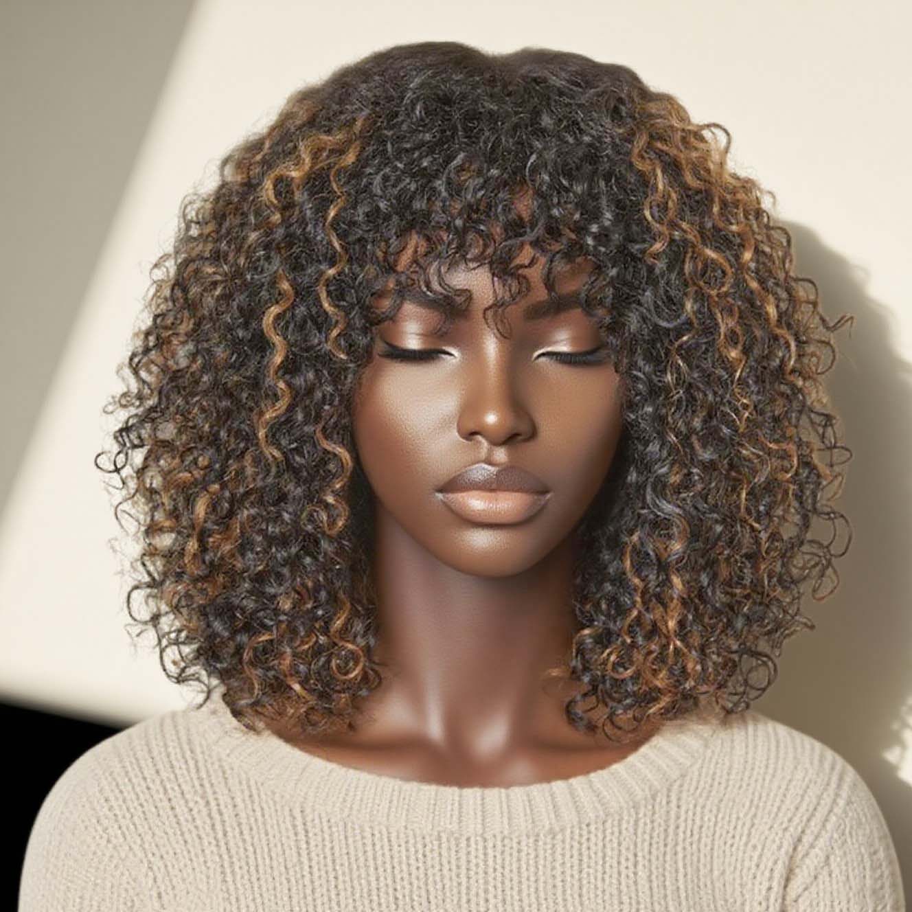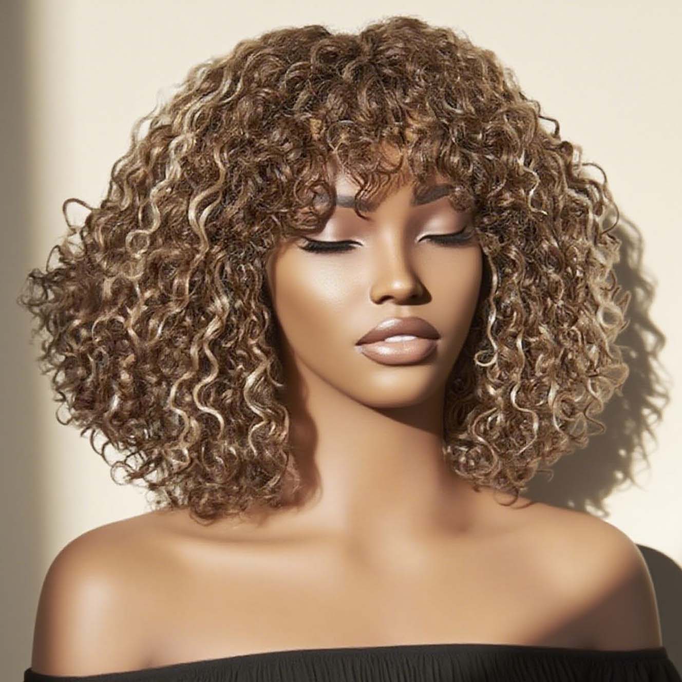 Beginner Friendly Water Wave Minimalist Lace Glueless Short Curly Wig with Bangs Mini-closure Lace Wig