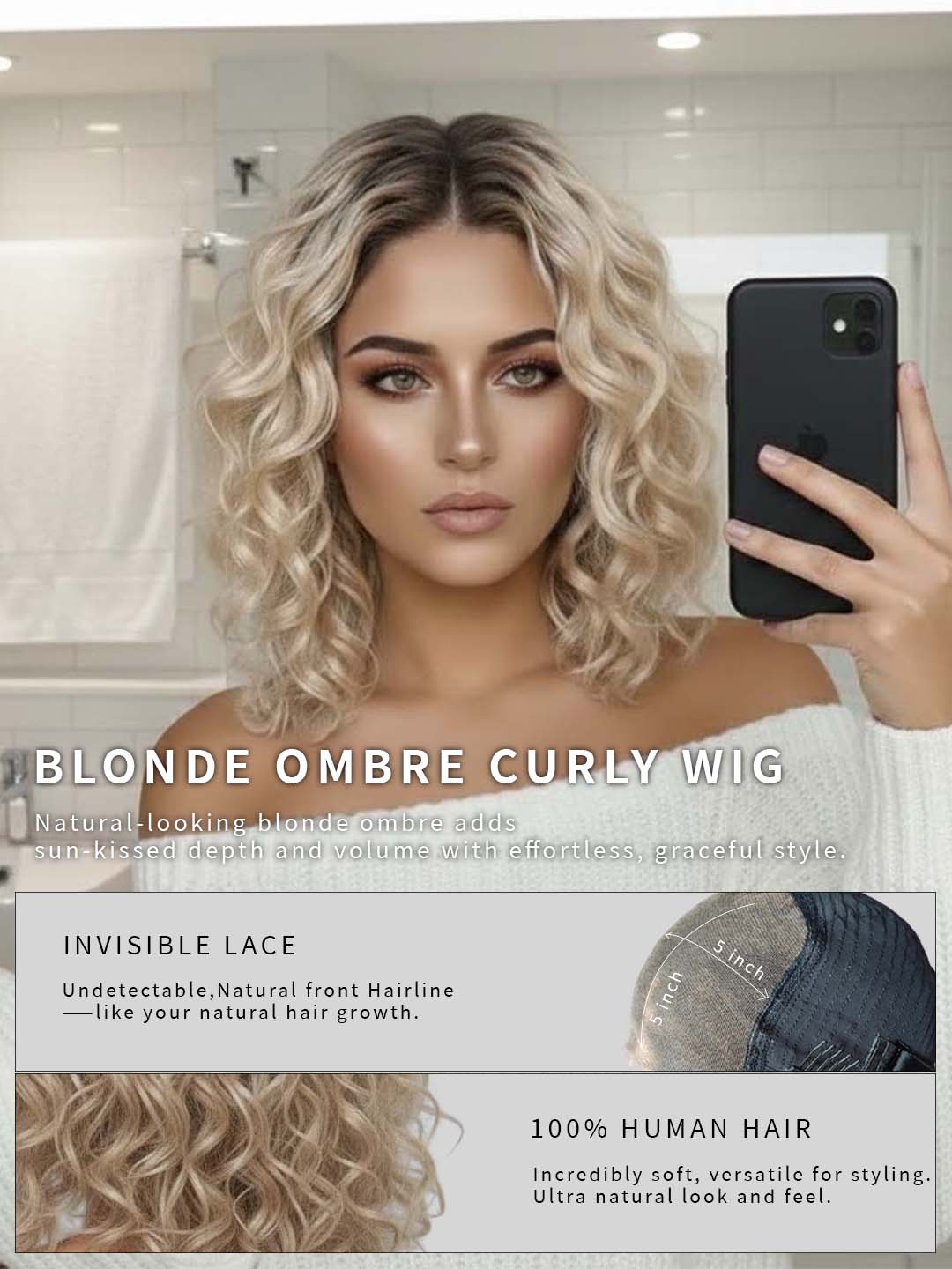 Human Hair 5x5 Lace Closure Wigs Blonde Ombre Curly Bob Glueless No Shedding Natural Hairline Pre Plucked