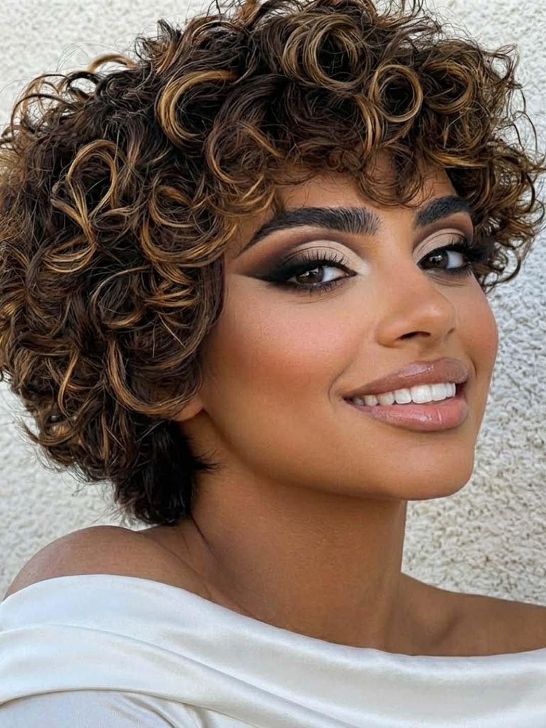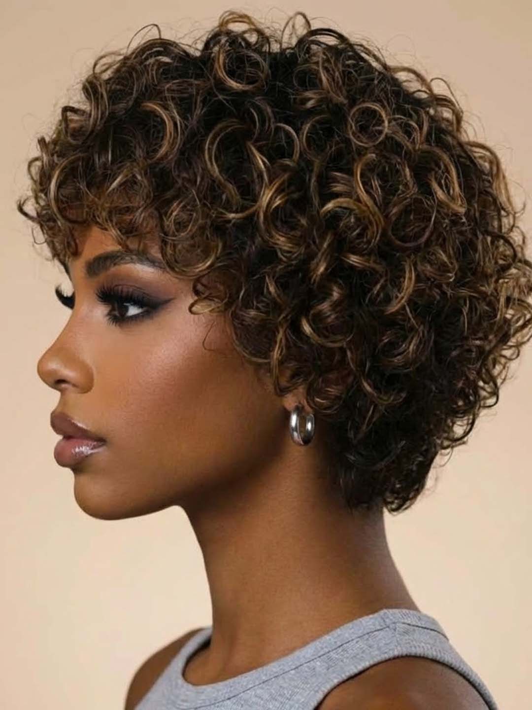 • Model Hair Length: 6 inches – The perfect short, curly pixie cut for a modern, chic look.